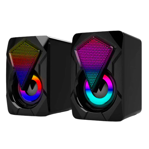 Altavoces externos con diseño compacto y llamativa iluminación multicolor RGB. Producen un sonido envolvente ideal para mejorar la experiencia gaming o multimedia. Fabricados con un gabinete de PVC resistente, ofrecen una potencia nominal de 2x3W y funcionan con alimentación USB 5V.