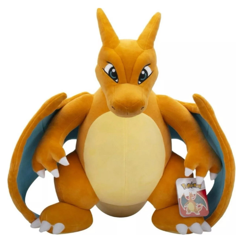 Gran peluche de Charizard, el popular Pokémon tipo fuego. Su diseño detallado y su tamaño jumbo lo hacen perfecto para entrenadores Pokémon y amantes de los peluches de colección.